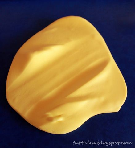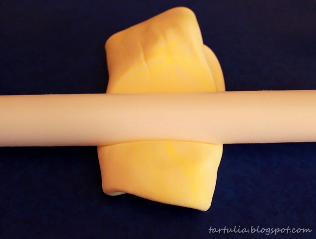 Tomamos la cantidad necesaria de fondant para cubrir la parte mas ancha de Bob, con un palillo untamos con colorante amarillo.