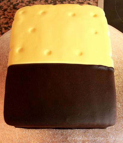 Amasamos fondant de chocolate negro o bien teñimos fondant con marrón oscuro para la parte inferior del cuerpo de Bob, yo opte por fondant de chocolate. Casamos de nuevo, esta vez con la línea del amarillo, ajustamos a la tarta y recortamos bordes.