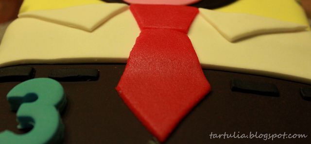 A continuación, extendemos fondant blanco y cortamos una franja con la que cubriremos la unión del amarillo y marrón a modo de camisa, recortamos en fondant rojo las dos piezas de la corbata cuidando que exista proporción y pegaremos en el centro de Bob y desde el borde superior de la camisa.