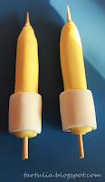 Modelamos dos trocitos de fondant iguales dándoles forma como de tuerca y con la esteca de bolillo hacemos de nuevo una hendidura lo suficientemente profunda para introducir después las piernas de Bob. Modelamos dos tiras de fondant amarillo a los que introduciremos un trocito de brocheta, recubriremos una parte con fondant blanco y terminaremos los calcetines con dos tiritas de fondat rojo y azul.