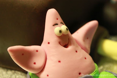 El resto de complementos de la tarta, modelados, números o letras ya son al gusto de cada uno. Yo le puse el número del cumpleaños doble en el borde del pantalón, las letras a un lado y el día antes habí modelado a su mejor amigo Patricio Estrella y su mascota Gary que coloqué en los bordes inferiores de la tarta.