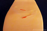 Colocamos el fondant amarillo casándolo con la línea y recortamos los bordes. Con una esteca de bolillo marcamos las hendiduras de Bob tanto en la parte superior como en los bordes.