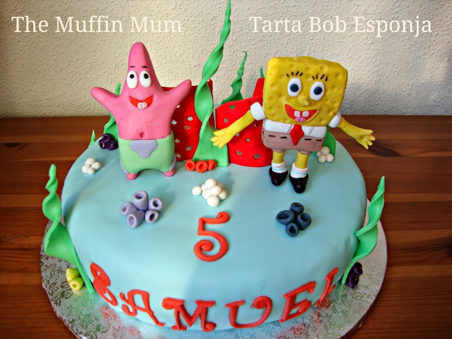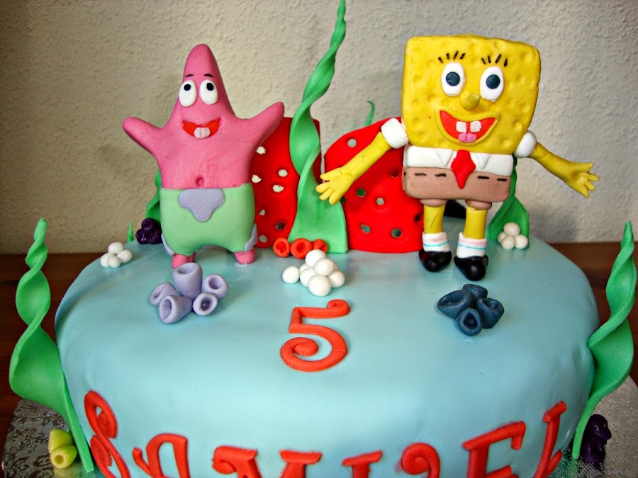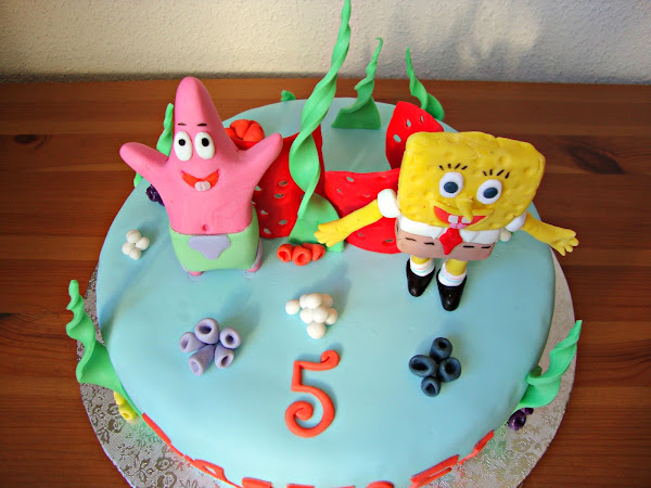 Mi hijo para su quinto cumpleaños me pidió una tarta de Bob Esponja y aunque no me hacía mucha gracia la idea, al final le modelé como pude alguno de sus personajes, no es de mis mejores trabajos pero a mi hijo le gustó que era lo importante.