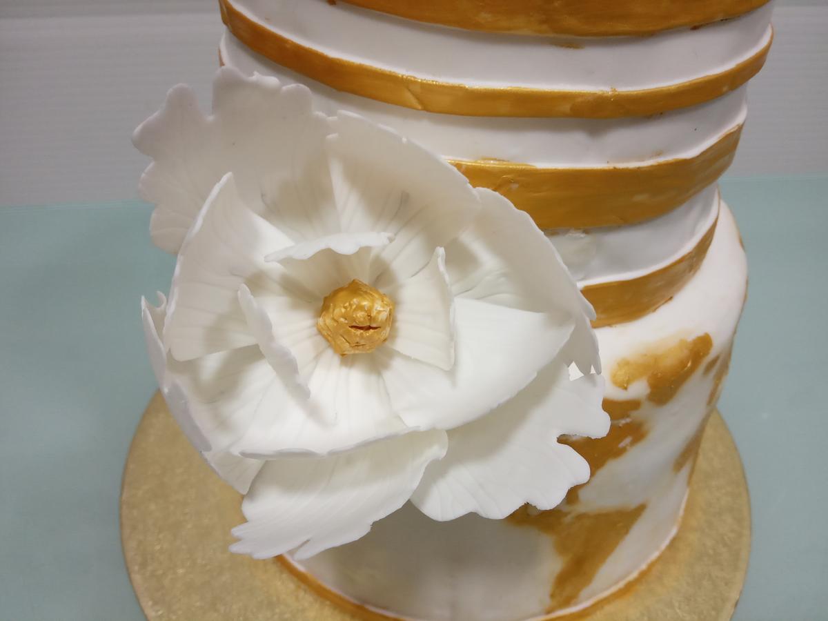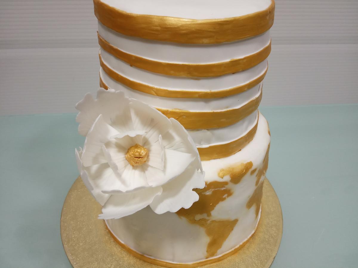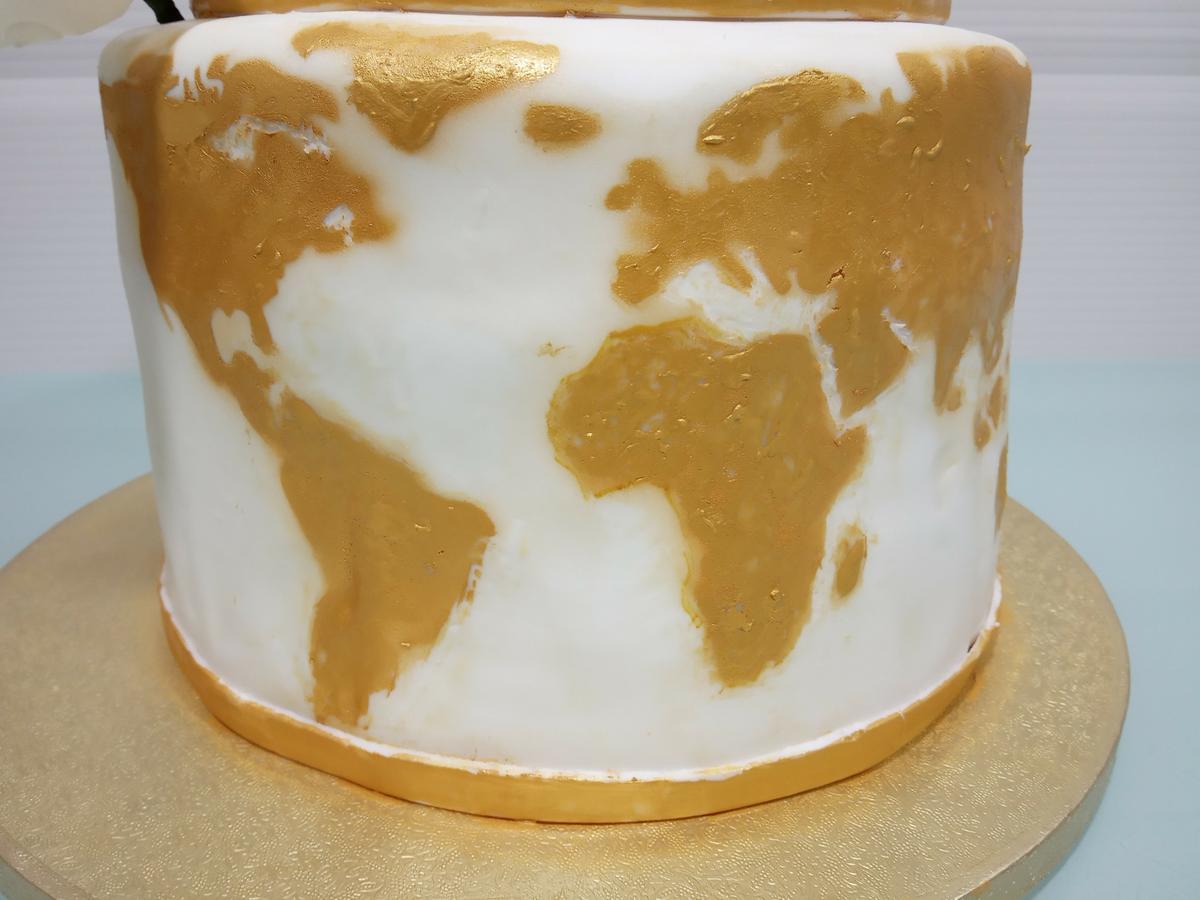 El piso inferior está forrado con fondant blanco y tiene un mapamundi pintado en color dorado.
