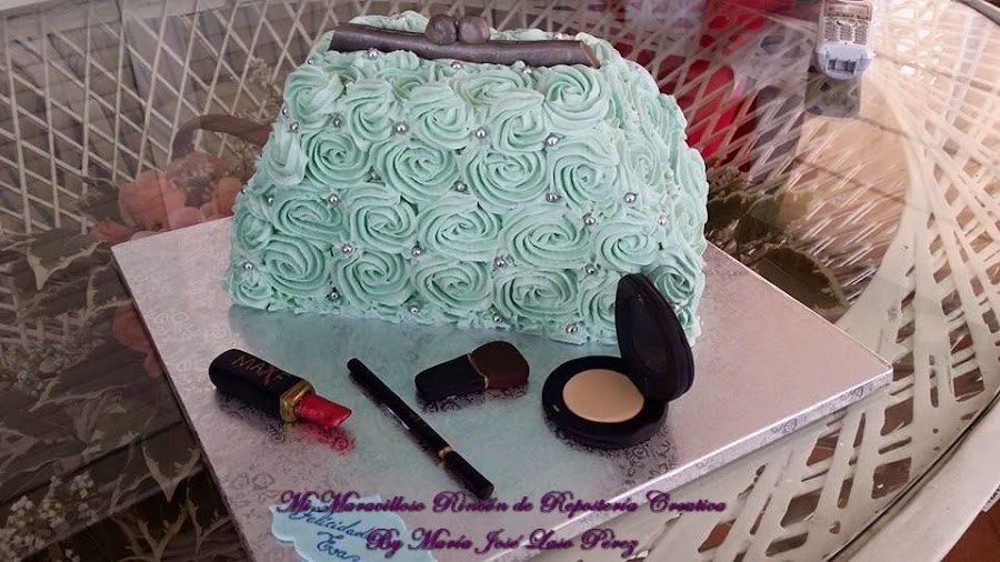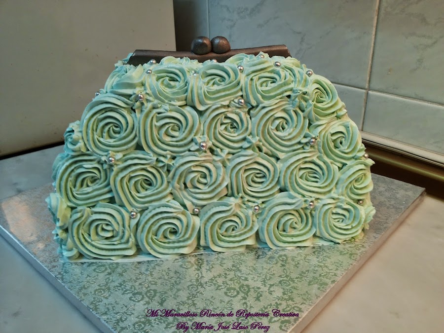 Y en este día tan señalado para ella, tenía que hacerle un regalo. Yo se que le gustan mucho las tartas de frutas, pero esta vez no quería regalarle una tarta sencilla. Llevaba tiempo deseando hacer una "tarta bolso de rosas", me parecen tan delicadas y elegantes que ésta era la ocasión perfecta puesto que se trataba de un detalle muy especial. Y éste ha sido el resultado...