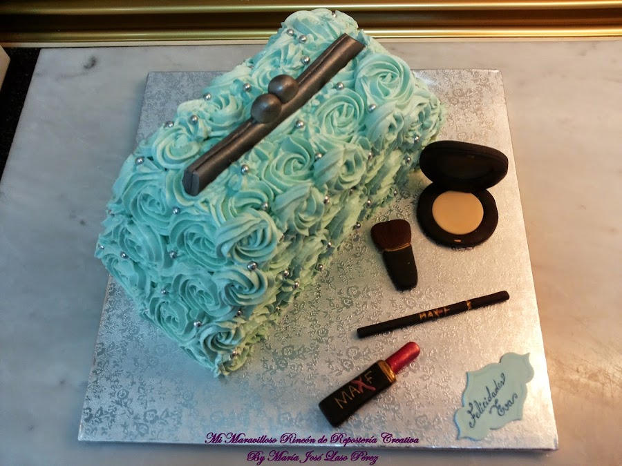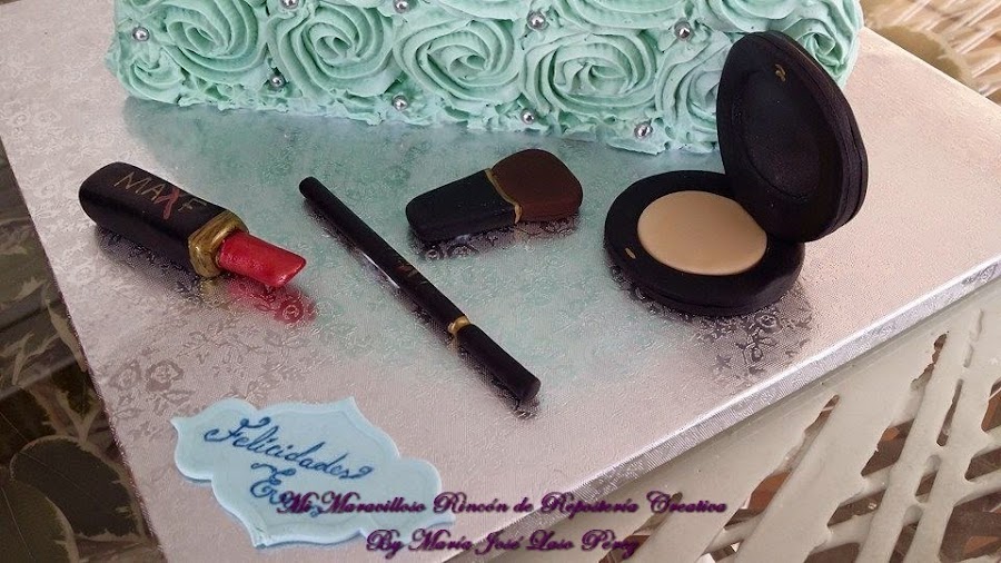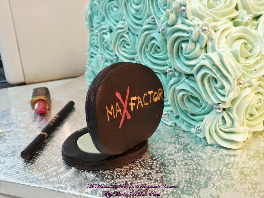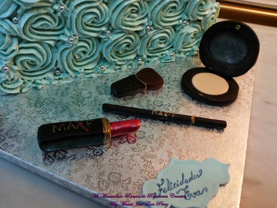 Al principio dudaba entre dos colores, pero al final me decidí por el verde manzana, que era un color mucho más fresco y además iba acorde con el sabor de la crema de la tarta, ¡aparte de ser el color favorito de mi amiga! Como es muy coqueta, pensé que los cosméticos en fondant le darían un toque estupendo al conjunto, por eso modelé una caja de polvos, una brocha, un lápiz de labios y un delineador de ojos.