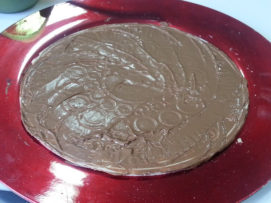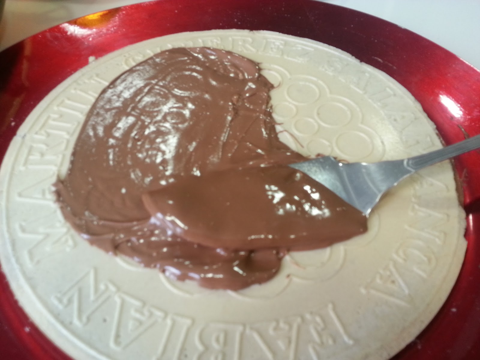 1. - Ponemos en el microondas 15 segundos o hasta que este casi líquida la crema de cacao , y ponemos un poco en el plato para fijar la primera oblea, y untamos con una fina capa de crema por toda la superficie.