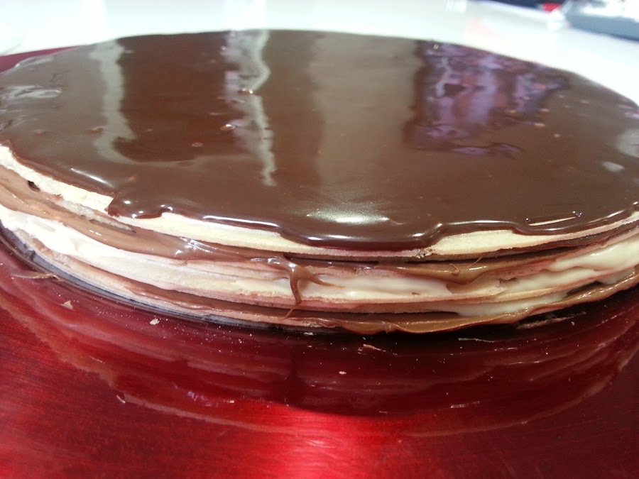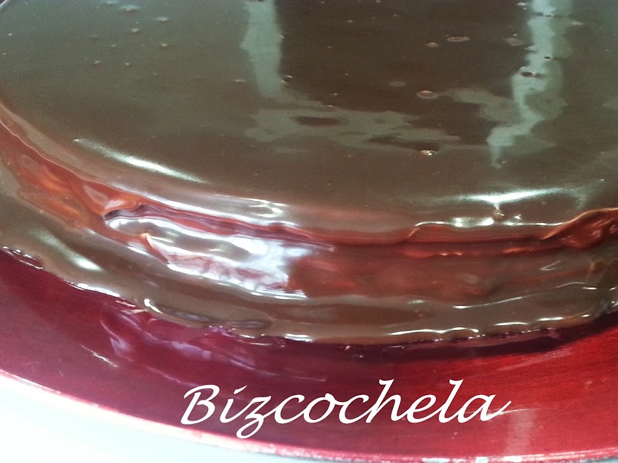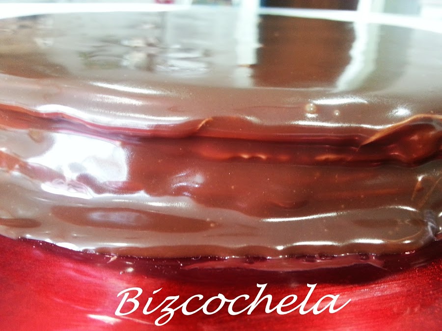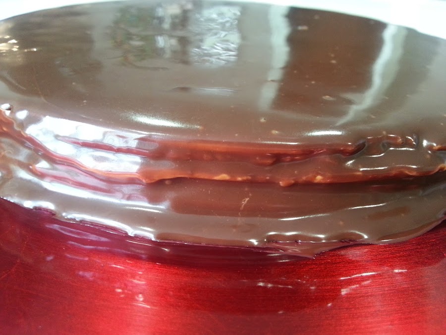4. - Para cubrir, metí en el microondas el chocolate troceado con la nata (crema de leche) y cuando ya estaba todo el chocolate fundido lo fui echando por encima de la última capa.