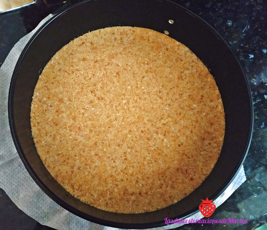 Trituramos las galletas y mezclamos con la mantequilla derretida. Ponemos bien extendida la mezcla en la base del molde y guardamos en el frigo.