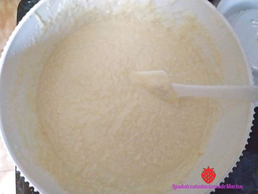 Escurrimos las hojas de gelatina, y las echamos en un bol con la leche caliente. Mezclamos bien para que se integre completamente. Cogemos una cucharada de la masa anterior y vertemos en el bol con la gelatina para y removemos para integrarlo perfectamente. Ahora agregamos la gelatina al bol de la masa que habíamos reparado anteriormente. Removemos para integrar bien.