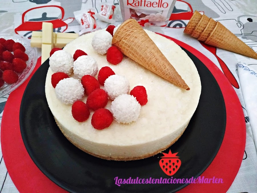 Transcurrido el tiempo, sacamos la tarta del frigo y desmoldamos con cuidado. Seguidamente la decoramos al gusto. Yo como veis la he decorado con bombones frambuesas y un cono de galleta.