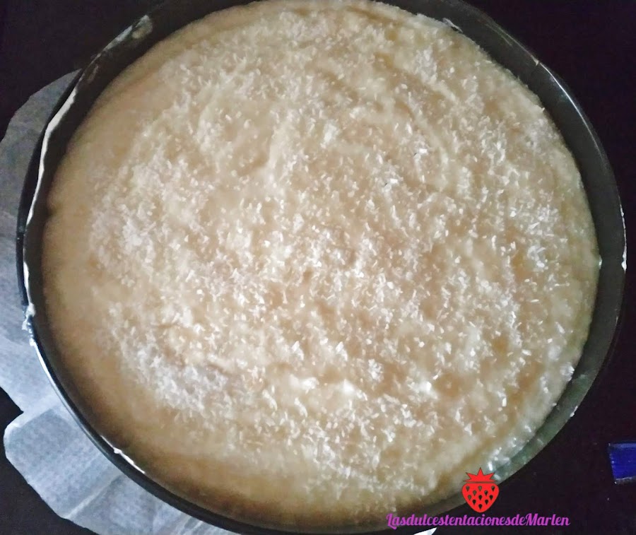 Una vez está todo bien mezclado, lo vertemos en el molde que teníamos preparado. Añadimos coco rallado por la superficie de la tarta y dejamos reposar unas 6 horas en el frigo, (a mí me gusta dejarlo toda la noche).