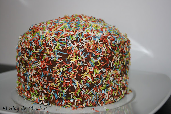 La tarta no es más que un bizcocho hecho con un molde de 15 cm y alto, de chocolate blanco y por dentro rellena de chocolate negro y cubierta toda con él. Luego con mucho cuidado y ayuda de una espátula, puse los fideos de colores.