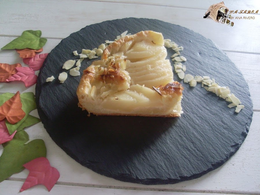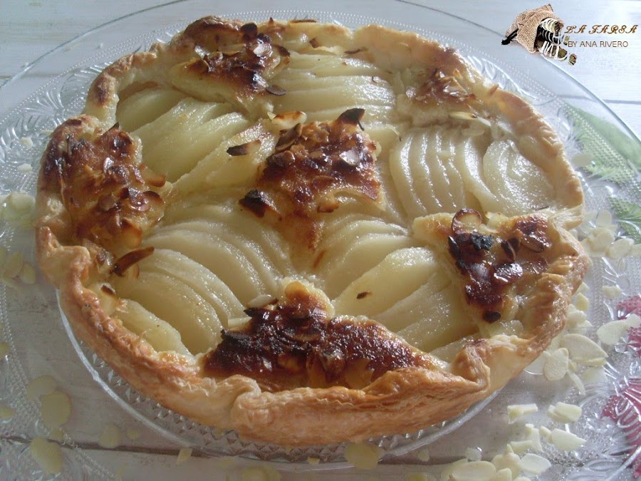 Filetear las peras y con la ayuda de un cuchillo y la mano, colocarlas en forma de estrella encima de la crema