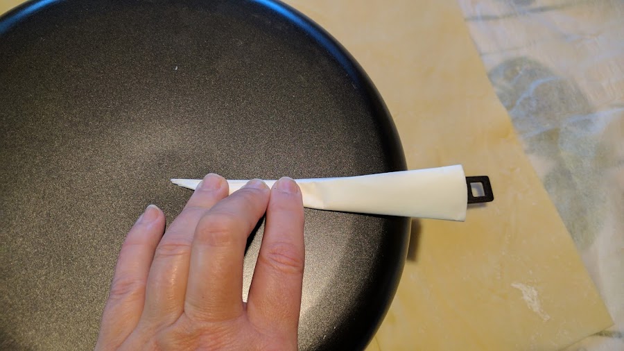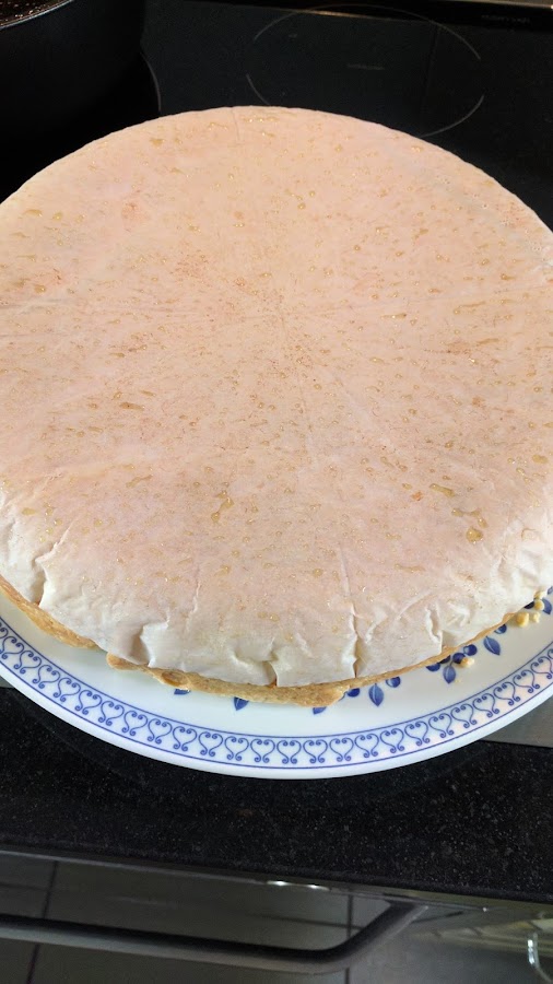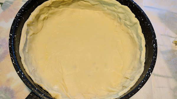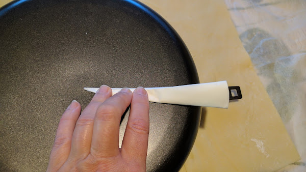 Unimos las dos bases de hojaldre para poder hacer un círculo del tamaño de la cubeta. Hay que dejar unos tres cm de margen