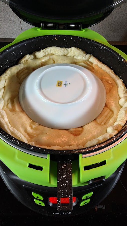 Al acabar ponemos menú manual otros tantos minutos y 170 grados. A los 5 minutos empieza a dorarse la superficie, tapamos con papel de aluminio apto para cocinar la parte central. Yo no tenía y puse un plato de porcelana que aguanta el calor