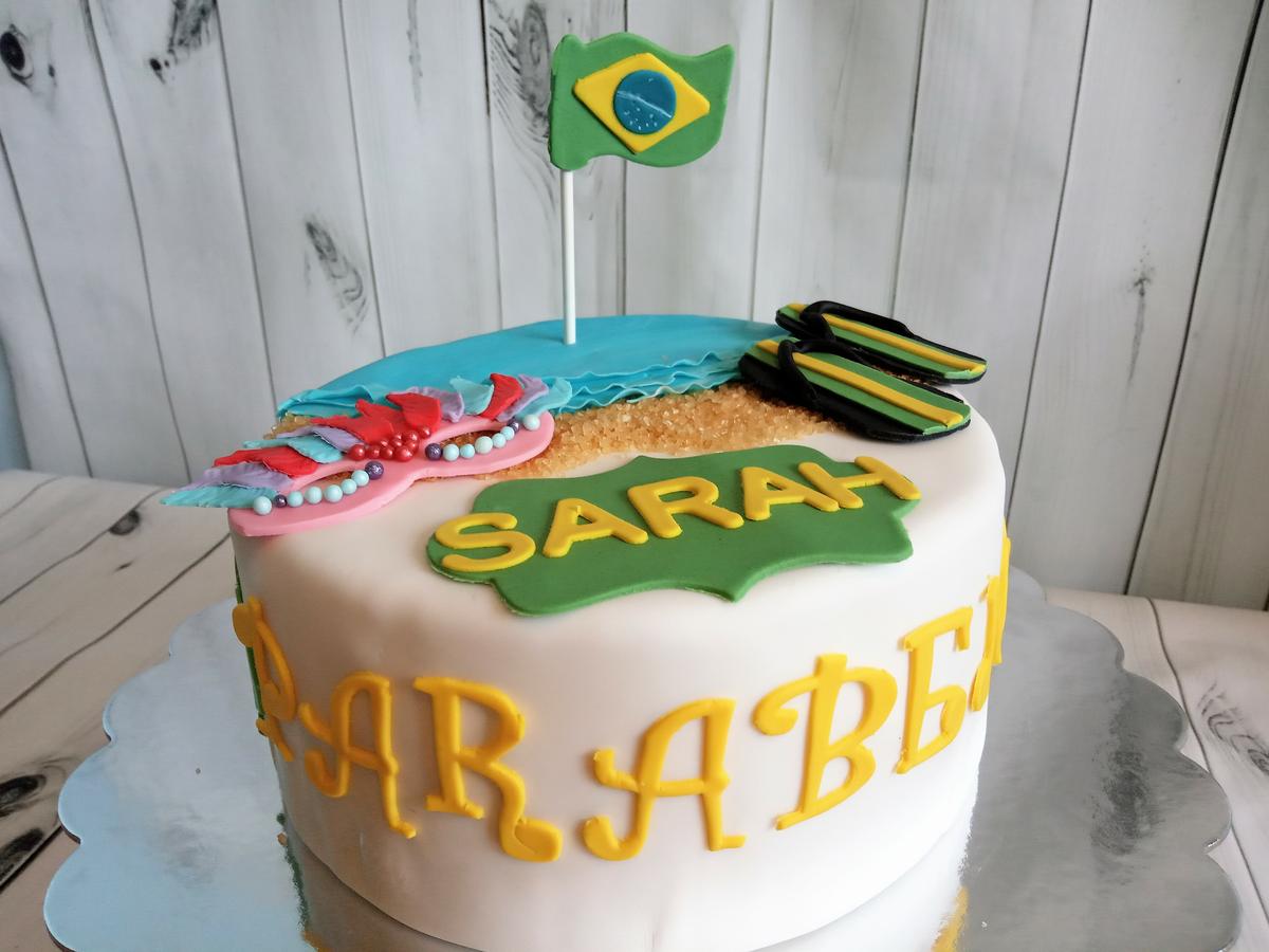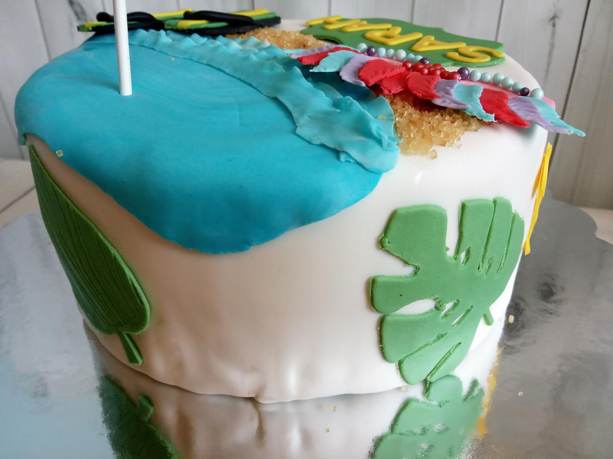 La decoración está realizada con fondant, azúcar moreno y sprinkles de colores.