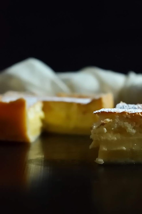 Déjala enfriar, mejor de un día para otro para que se asiente bien y cuando la partas te llevarás la sorpresa que me llevé yo. Si está bien preparada verás que el interior de la tarta está dividido en tres capas: bizcocho, flan y pudding. Es como es pastel mágico, pero con la base de masa quebrada que aquel no lleva y sin vainilla que no lleva éste.