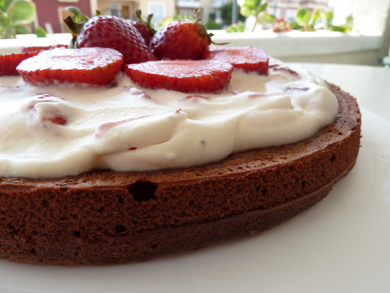 1) Poner el frosting de nata (crema de leche) con fresas sobre la superficie del brownie.