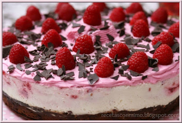 Me ha costado ponerle un nombre relativamente corto a esta tarta. En realidad es un brownie por una parte y una tarta de queso con marmolado de frambuesa por otra. Pero es una fusión, así que necesitaba otro nombre y éste me ha parecido el mejor.