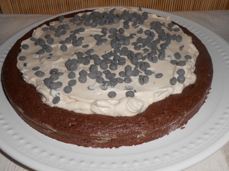 Mientras el brownie está en el horno hacer la crema batiendo la nata (crema de leche) con el azúcar, el estabilizante ; montar, luego agregar el queso, agregar los chips y el baileys. Reservar un poco de chips para la decoración.