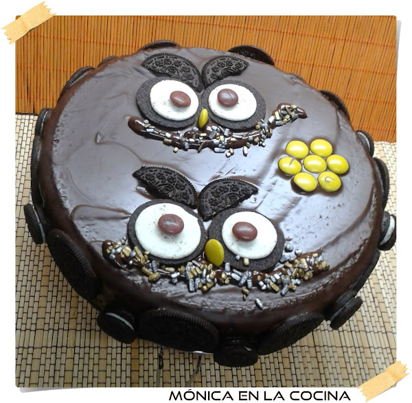 Decorar los laterales de la tarta con galletas Oreo abiertas por la mitad, alternando las Oreos mini. En la parte superior, realizar un par de búhos sobre una rama, para ello, utilizar las galletas Oreo doble relleno, abrirlas por la mitad y serán los ojos, colocándoles lacasitos marrones y lacasitos amarillos para hacer el pico.