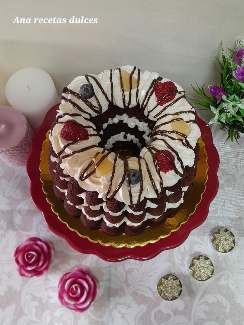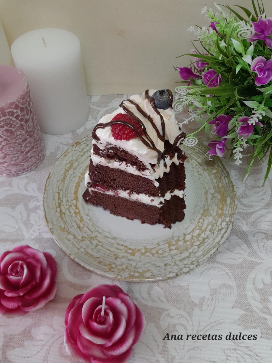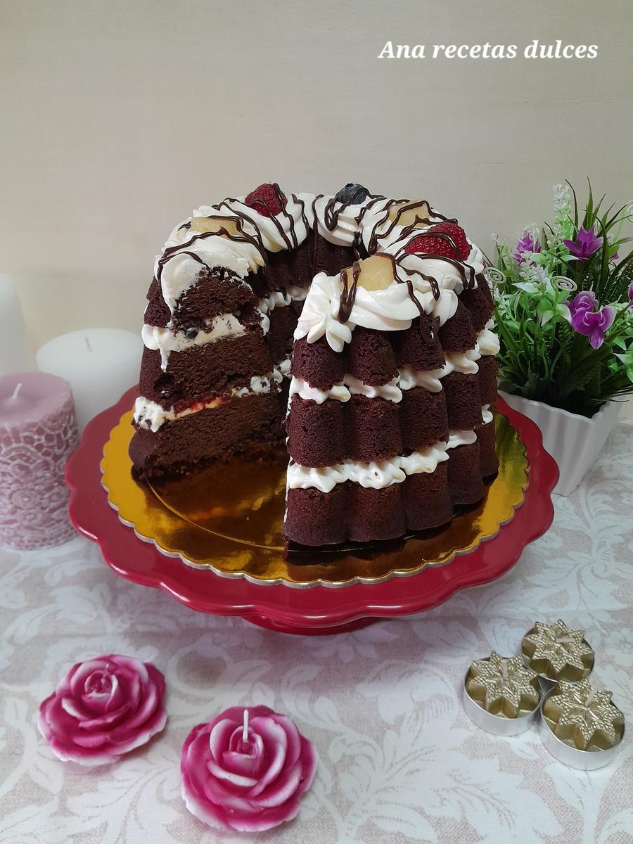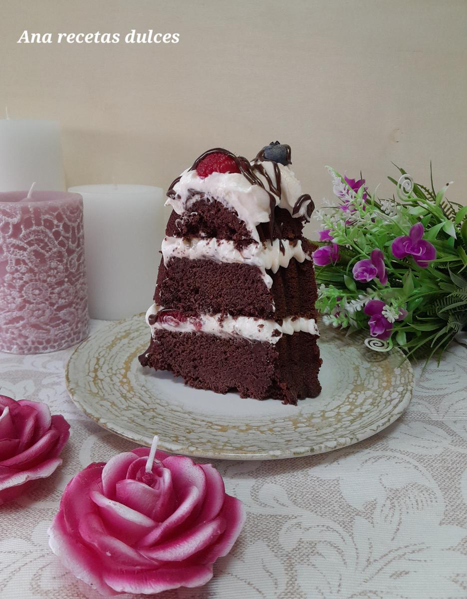 Es una receta fácil y sencilla de preparar, no tiene ninguna complicación, lleva un bizcocho de chocolate con una miga tierna y esponjosa, rellena con un suave y cremoso frosting de nata (crema de leche) y queso, acompañada con arándanos, frambuesas y piña, además de una rica ganache.