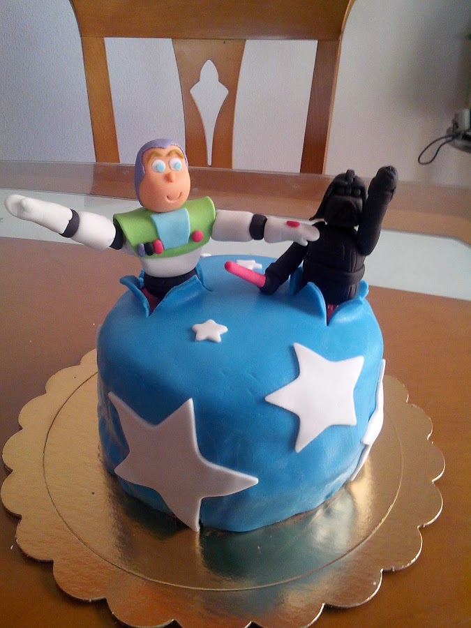 TARTA BUZZ LIGHTYEAR CONTRA DARK VADEREsta es la ultima tarta que he hecho ea para unos hermanos que cumplian el mismo dia los años y me encargo su madre esta tarta. Al hijo le gustaba Buzz y la hija le gustaba Dark Vader. Se le ocurrio que podian estar luchando entre ellos y bueno asi quedo. Voy abanzando poco a poco en el tema de modelar personajes.