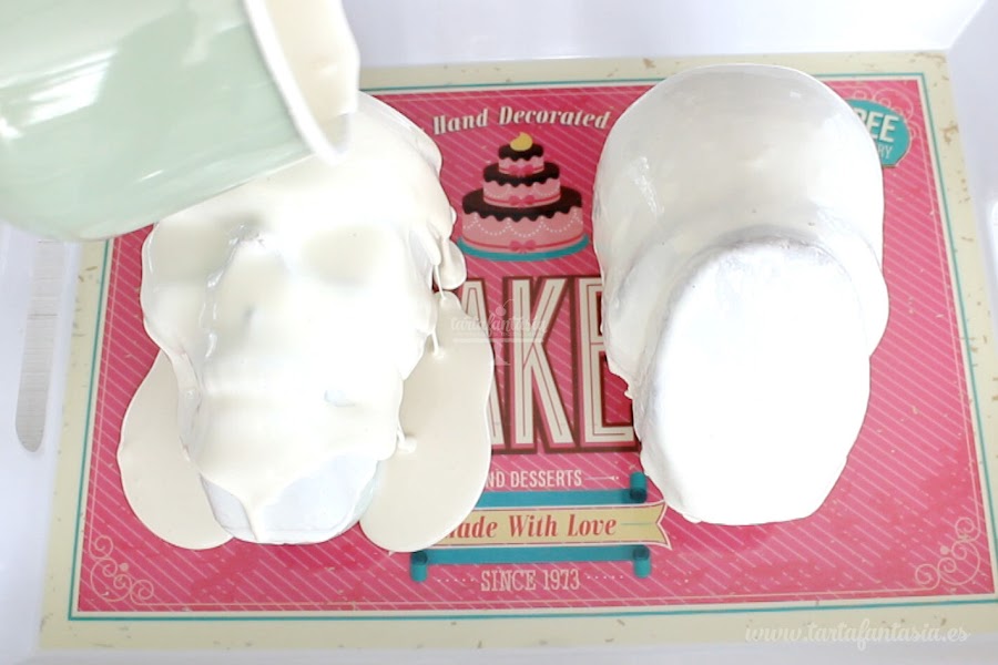 Para esta ocasión quería un bizcocho muy jugoso, que no necesitase almíbar ni relleno, y sin dudarlo la receta perfecta es la del bizcocho para tartas esculpidas o 3D, muy jugoso y húmedo, además necesitaba una cobertura que quedase lisa y que respetase las curvas del bizcocho, que lo cubriera bien pero que no perdiese la forma, la candidata perfecta la cobertura espejo de chocolate blanco.