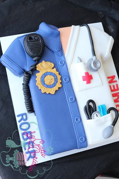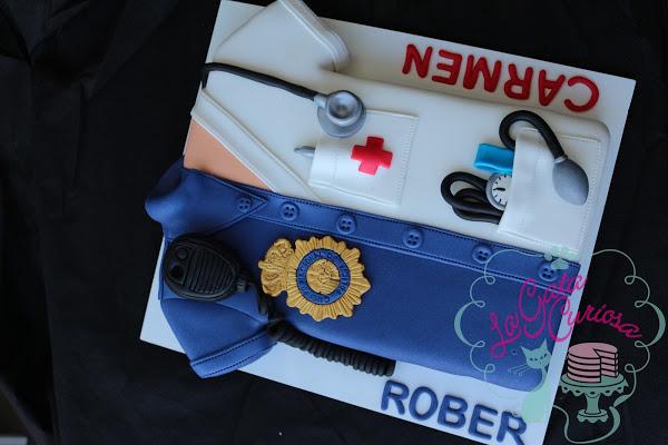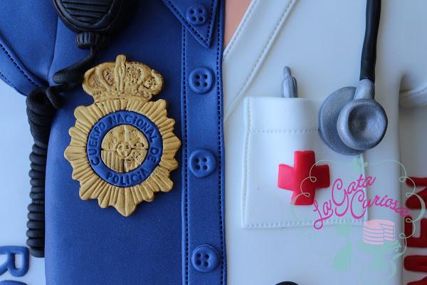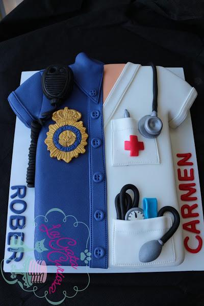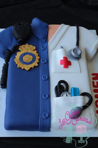 No habíamos hecho nunca una camisa de policía y esta vez nos hemos quedado justo a la mitad, para completar la tarta la otra mitad es una camiseta de enfermera que tampoco habíamos hecho nunca (de medico si), el conjunto de las dos ha quedado bastante bien.