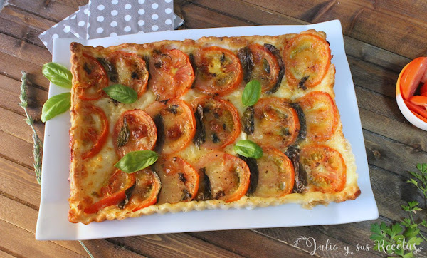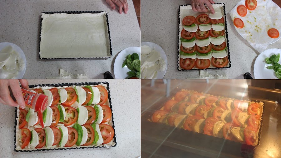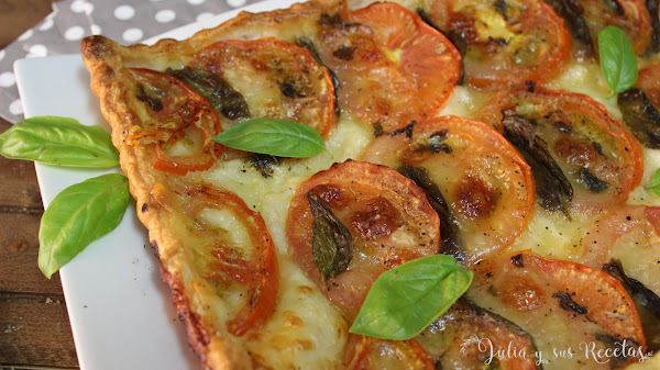 Hoy os traigo esa misma ensalada pero en tarta... una tarta caprese con albahaca, que queda además de vistosa , deliciosa y que podemos comer en caliente o en frío, como más nos apetezca.