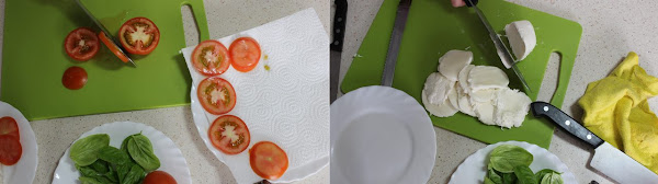 Cortamos los tomates en rodajas y los dejamos escurrir encima de un papel de cocina. Cortamos la mozzarella en rodajas ni demasiado gruesas , ni demasiado finas...