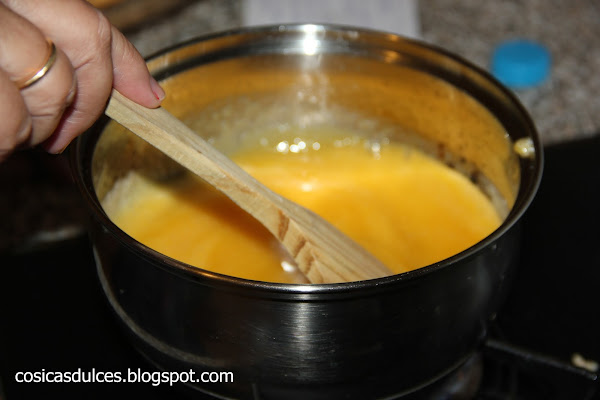 Transcurrido el reposo pasamos a preparar la crema de yema. Preparamos para ello un almíbar muy espeso y lo vertemos en forma de hilo sobre las yemas batidas sin dejar de remover. Una vez que esté bien mezclado volvemos a llevar la crema al fuego hasta que espese.