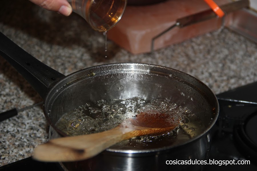 Vertemos la mezcla en un molde bien engrasado (de unos 25 centímetros) y horneamos a 180 grados aproximadamente 20 minutos. Mientras el bizcocho está en el horno preparamos el almíbar, para ello calentamos a fuego alto el agua con el azúcar (debe espedar ligeramente pero sin llegar a tomar color). Un par de minutos antes de retirarlo del fuego le añadimos el cointreau.