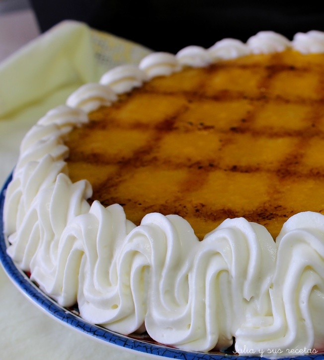 - 1 cucharada sopera de queso mascarponeTambién podemos adornarla haciendo un merengue con las claras que nos han sobrado, pero yo he preferido con nata (crema de leche) para que no esté demasiado dulce. Las claras las usé para otra receta que os pondré otro día.