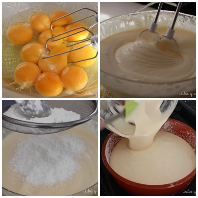 Vertemos el almíbar en las yemas poco a poco mientras las batimos y las ponemos al fuego hasta que espese, dándole vueltas continuamente para que no se nos pegue.