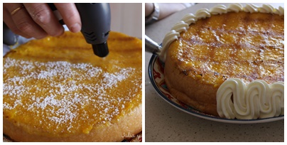 Cubrimos la tarta con ella. Dejamos que se enfríe completamente. Espolvoreamos bastante azúcar glas encima y vamos haciendo rayas con un soplete formando un enrejado.