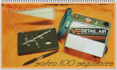 Bueno, y ahora os traigo un peazo de concurso que ha preparado Rocío de http://www.misdulcesdias.com/, que sortea nada más y nada menos que un peazo de aerógrafo, os imagináis????? que de cosas podemos hacer en nuestras tartas con eso??? ufffffffffff, es una pasada, y ella quiere celebrar sus 100 seguidores de este modo, yo os diría que no os apuntáseis ninguno (más oportunidades para mí, jajajja) pero es que es un regalazo y quería compartirlo con todos vosotros. Para apuntaros os dejo aquí el enlace http://www.misdulcesdias.com/2011/10/sorteo-100-seguidores-mis-dulces-dias.html creo que no tenéis que dejar pasar una oportunidad así.