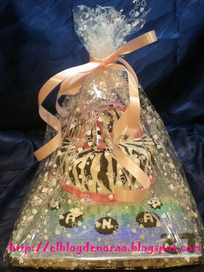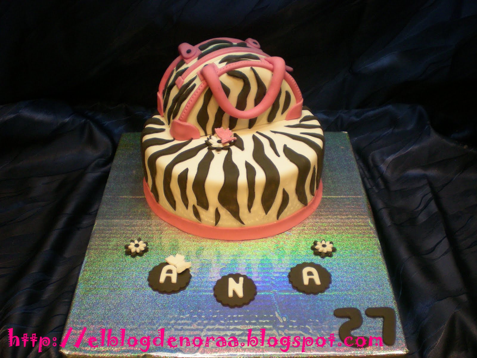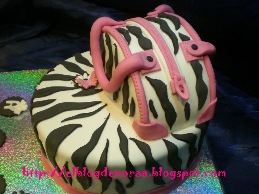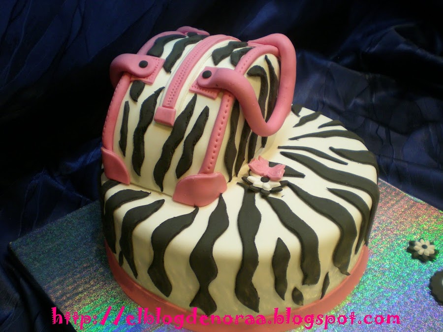 Bueno, y ahora sí, aquí os traigo la tarta que me encargó mí vecina y amiga Anita de http://anitametier.blogspot.com/ . Me dijo que le hiciera lo que yo quisiera, que me lo dejaba a mí elección, y al final me decidí por esta, una tarta cebra con un bolso encima, una tarta chic cómo ella!!! Era la 1:30 de la madrugada cuando le dí la tarta, ella salía de vacaciones a la mañana siguiente hacia Extremadura y cuando bajó a mí casa y vió la tarta se quedó sin palabras y al ratito se puso a llorar de alegría, no os imaginais lo que me llenó eso, se había emocinado con su tarta y eso me llenó de alegría, faltó muy pero que muy poco para que me pusiese a llorar yo, jajajaja, me imagino a mí marido si se hubiese levantado y nos ve a esas horas llorando en la cocina, pensaría que si estábamos locas, jajajajaja. La tarta llegó sana y salva a su destino, no se movió ni un pelin!!!!!
