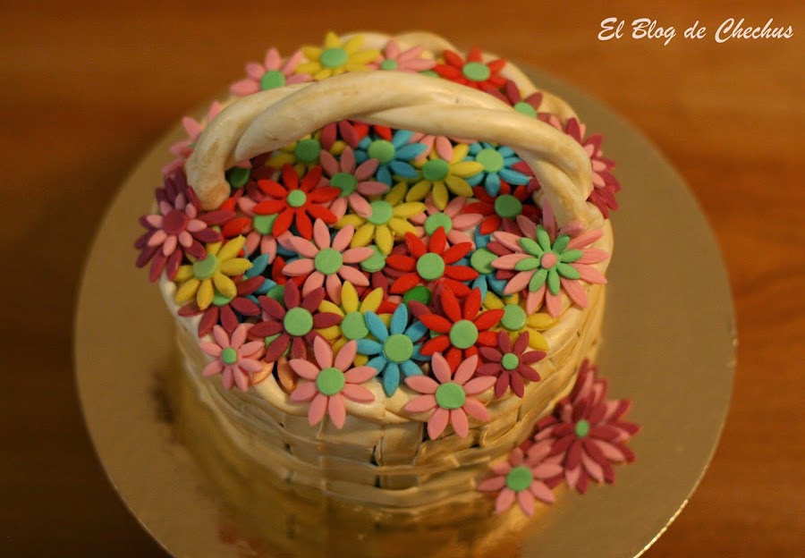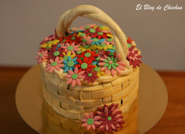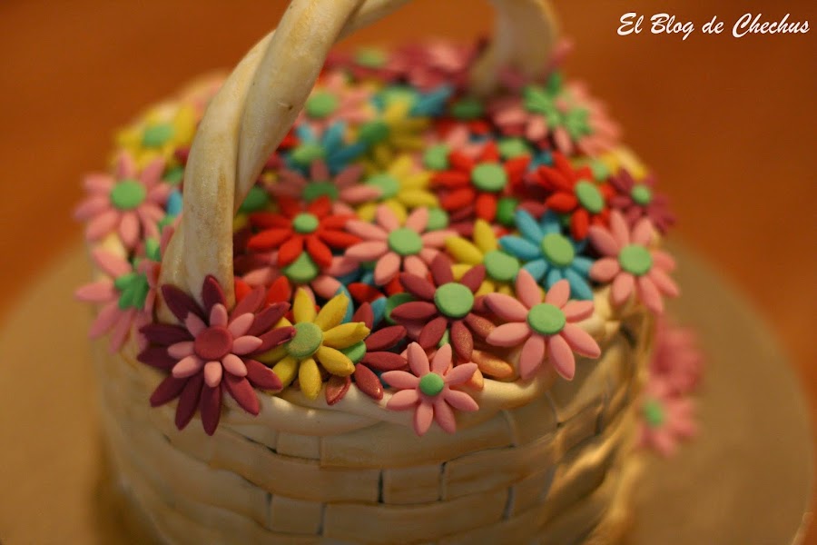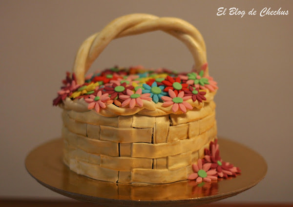 La elaboración de la cesta la podéis encontrar en el blog de cakesyetc.blogspot.com. La verdad es que parece mas complicado de lo que es. Yo la hice con fondant de color blanco, que luego tinte con un spray dorado.