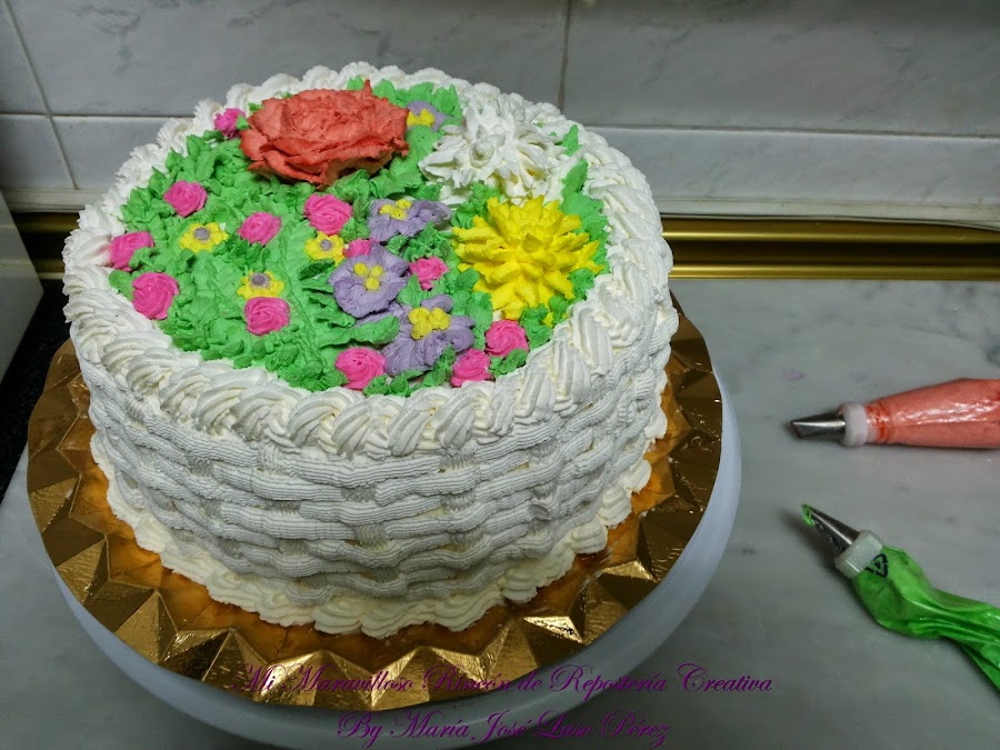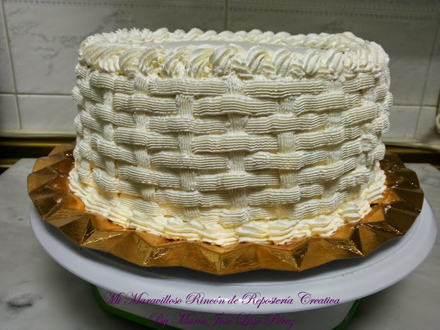 Para cubrir el contorno de la tarta, con el entramado de cesta usé la boquilla nº 47 de Wilton.