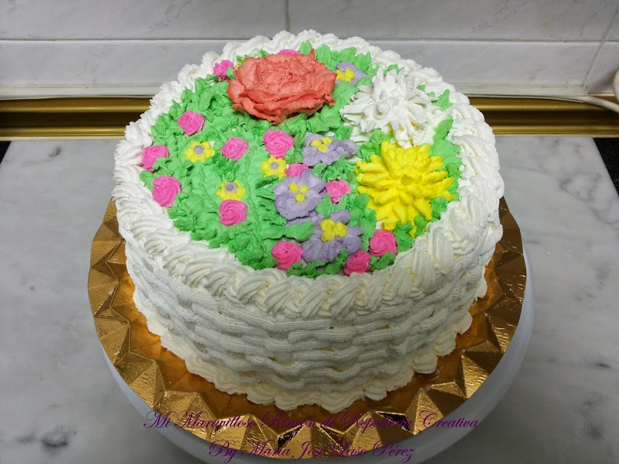 Así de bonita se vió la tarta, una vez hechas las flores de la parte superior. Las flores son un recurso muy hermoso para embellecer una tarta para un cumpleaños, u otro acontecimiento como puede ser el día de la madre. Con un poco de práctica y paciencia, seguro que conseguiréis diseños espectaculares.