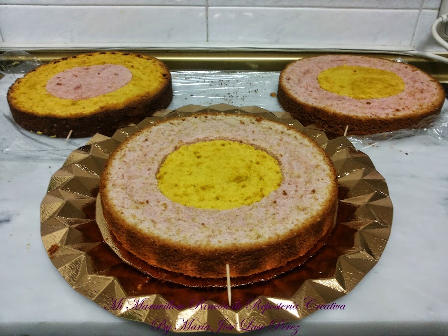 Corté por la mitad cada bizcocho, y a su vez la parte interior con una plantilla circular más pequeña, montándolo como se ve en la fotografía inferior (esto es para que a la hora de cortar el bizcocho se vea un corte bonito, en forma de tablero de ajedrez, también se llama bizcocho damero).