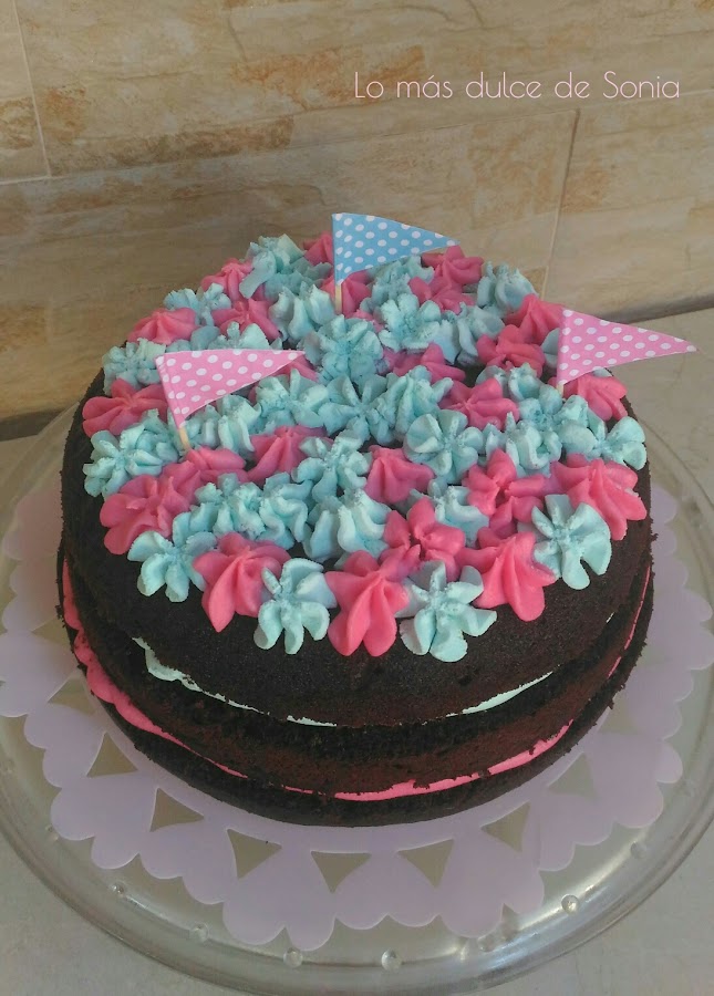 Antes de montar el ganaché, dividí en dos partes y añadí unas gotas de colorante wilton, azul y rosa.