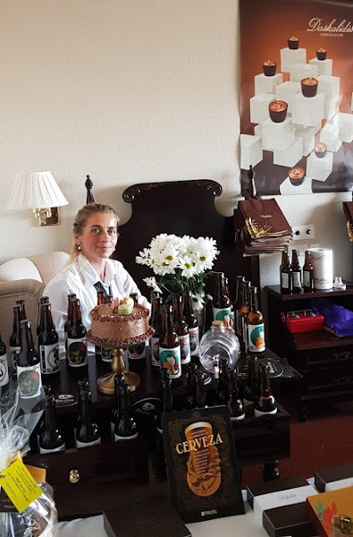 Patricia, dueña de la chocolatería. Posa con algunas cervezas de producción canaria y la tarta que hice para la ocasión