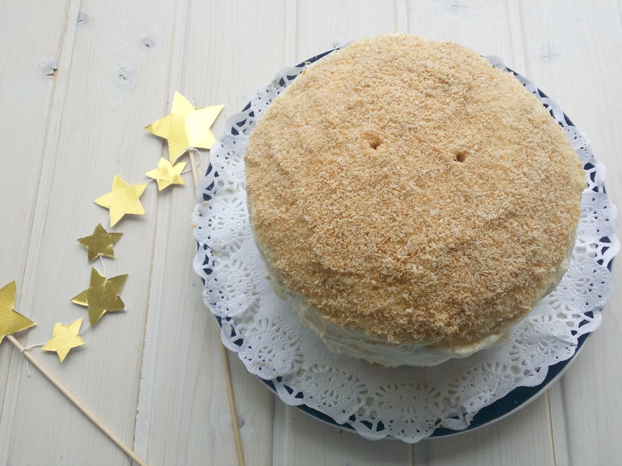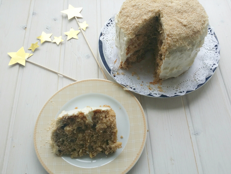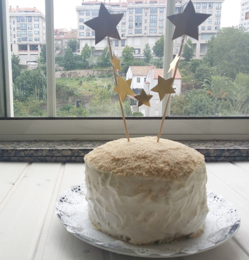 3. Colocamos encima el segundo bizcocho, decoramos al gusto. Podemos cubrir todo el exterior con la crema de queso, o sólo la parte superior. Podemos decorar con coco tostado, como hice yo, con unos sprinkles de colores, con nueces picadas... La imaginación, como siempre, al poder.
