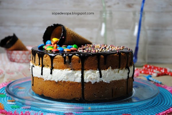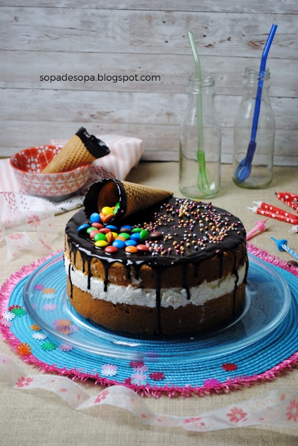 Sumergir la parte de arriba del cucurucho en el chocolate y deja que se endurezca. Mientras dejamos que pierda temperatura el chocolate para que no esté demasiado liquido. Con una cuchara echar chocolate por el alrededor de la tarta dejando que caiga un poco y el resto echarlo por encima alisándolo bien.