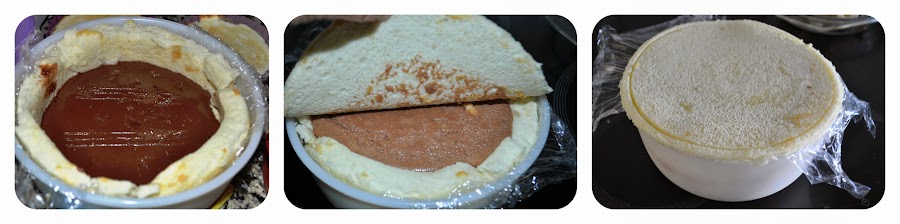 Comenzamos a montar la tarta porque va en varias partes. Cogemos un bol, de un tamaño no muy grande. Lo forramos con papel film y ponemos una de las planchas de bizcocho dentro. De otra plancha vamos cortando trozos para ir cubriendo el bol ya que la primera no me llegaba hasta el final. Una vez todo cubierto, echamos el relleno de chocolate que no tiene que estar caliente, más bien templado. Metemos en la nevera hasta que cuaje.