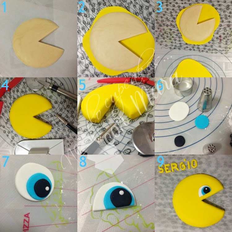 Para decorar la tarta he confeccionado un comecocos de chocolate plástico blanco, envuelto en fondant, a través del siguiente paso a paso os podéis hacer una idea.