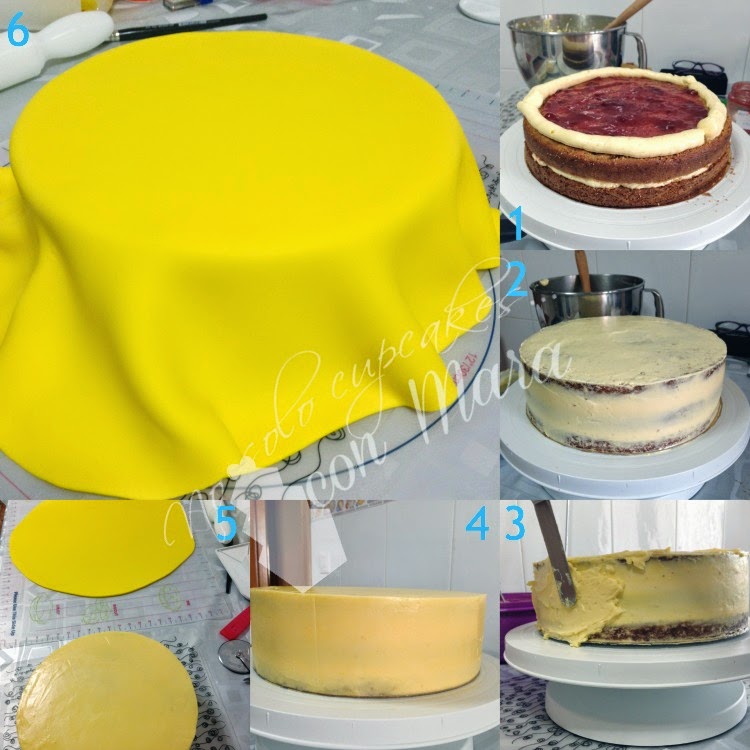 Enfriamos 10 - 20 min. en el molde y luego lo pasamos a una rejilla para que se enfrie completamente. Envolvemos el bizcocho frío en plástico transparente y lo refrigeramos por lo menos dos horas antes de rellenar y montar la tarta.Rellenamos con el buttercream a nuestra elección, en éste caso con mermelada de fresa y SMBC de limón, y cubrimos con fondant.